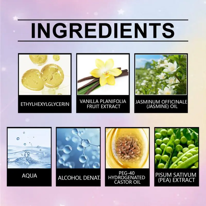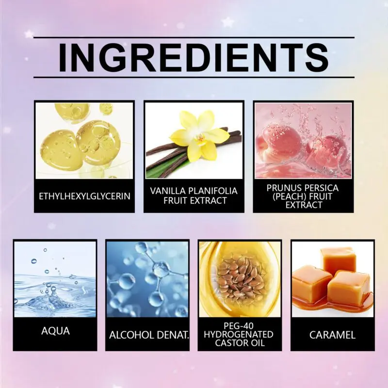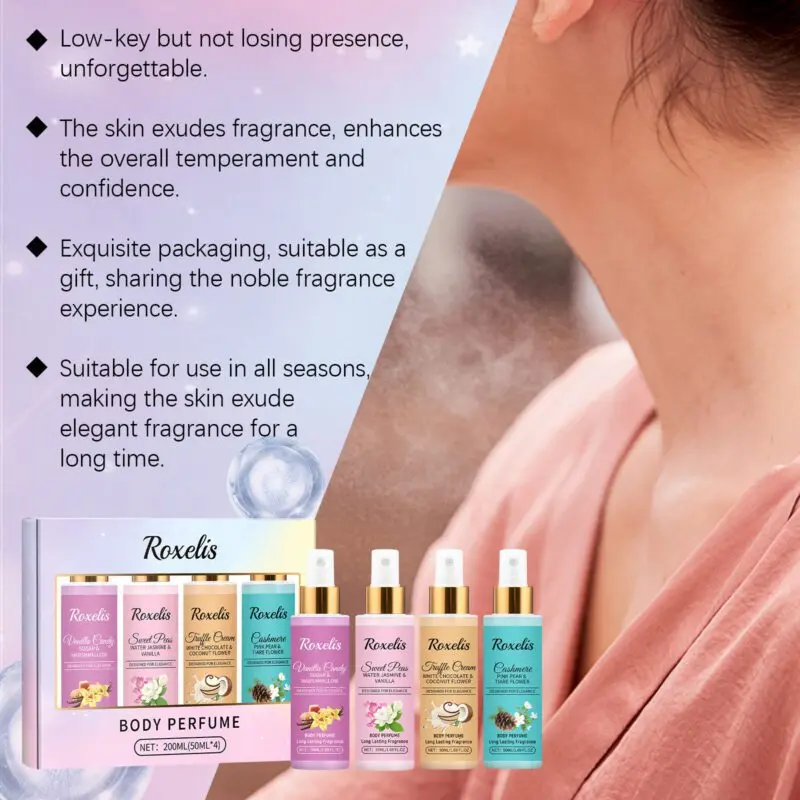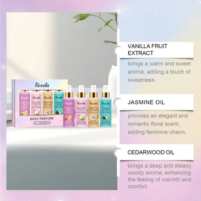 This body fragrance spray set features four distinct scents: Vanilla Candy (caramel and peach extract), Sweet Pea (vanilla fruit and pea extract), Truffle Cream (coconut oil and vanilla fruit extract), and Cashmere (gardenia extract and cedarwood oil). Designed to create a unique fragrance profile while enhancing sweetness, it offers a rich aromatic experience. For application, spray directly on pulse points like wrists and neck, or mist into the air and walk through for even distribution. Provides a fresh scent suitable for daily wear.