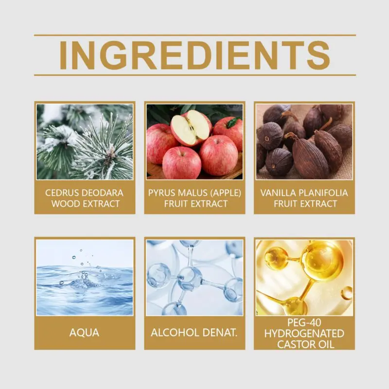 Cedar Men’s Perfume features a woody aroma with fresh cedar notes and subtle apple fruit accents. Formulated with denatured ethanol and PEG-40 hydrogenated castor oil for a soft, elegant scent. Apply by spraying on wrists, neck, and behind ears. For even distribution, mist into air and walk through. Maintains fragrance integrity throughout daily wear.