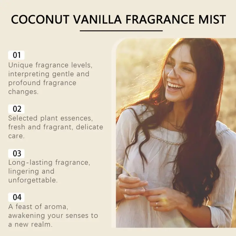 Coconut Vanilla body fragrance combines denatured ethanol with PEG-40 hydrogenated castor oil to create a balanced sweet aroma. Features versatile application: spray on pulse points or mist in air for even distribution. Lightweight formula provides fresh scent that complements natural body chemistry. Ideal for daily use with quick-drying, non-sticky texture. Compact bottle design ensures easy portability.