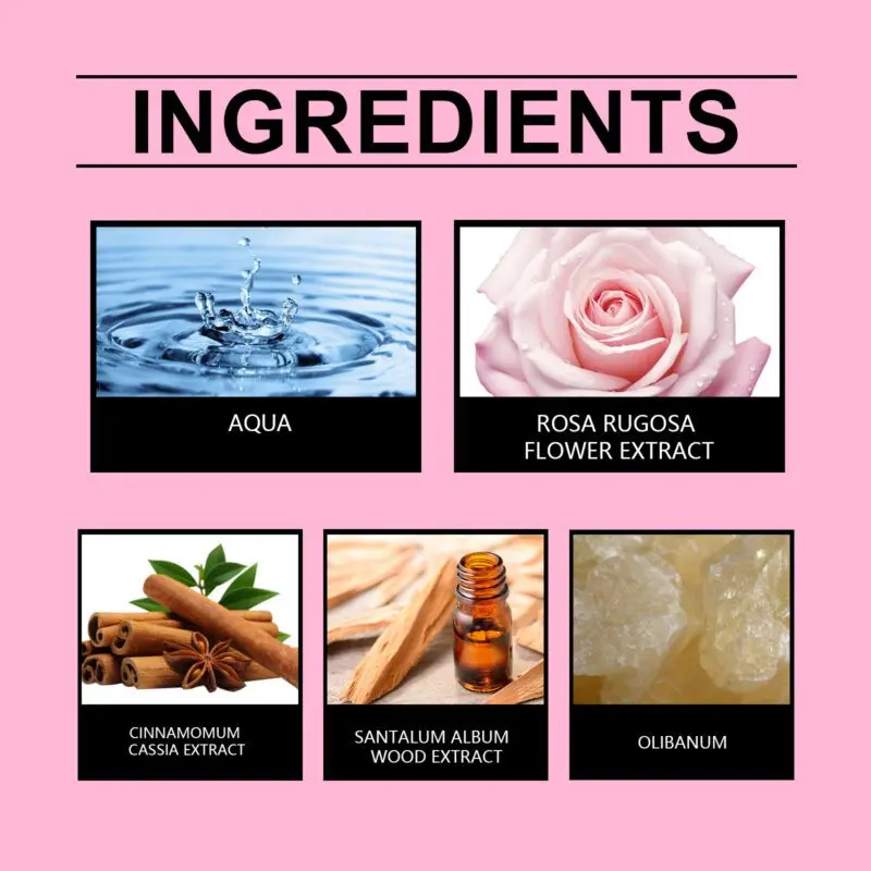 Women’s eau de parfum featuring rose, cinnamon, and sandalwood extracts for an elegant floral scent with warm, spicy undertones. This long-lasting fragrance develops layered woody aromas when applied to pulse points. Apply to wrists, behind ears, or temples and allow 2 minutes for scent development. Provides day-long fragrance retention with balanced floral and spicy notes suitable for various occasions.