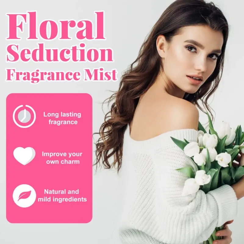 Floral Seduction Fragrance Mist features natural essential oils including Orange Peel, Lemon Peel, and Orange Fruit Extract. This fresh, elegant scent enhances personal confidence for social gatherings and special moments. Simply spray on pulse points or mist in air for even distribution. Provides a sophisticated, long-lasting aroma suitable for daily wear or romantic occasions.