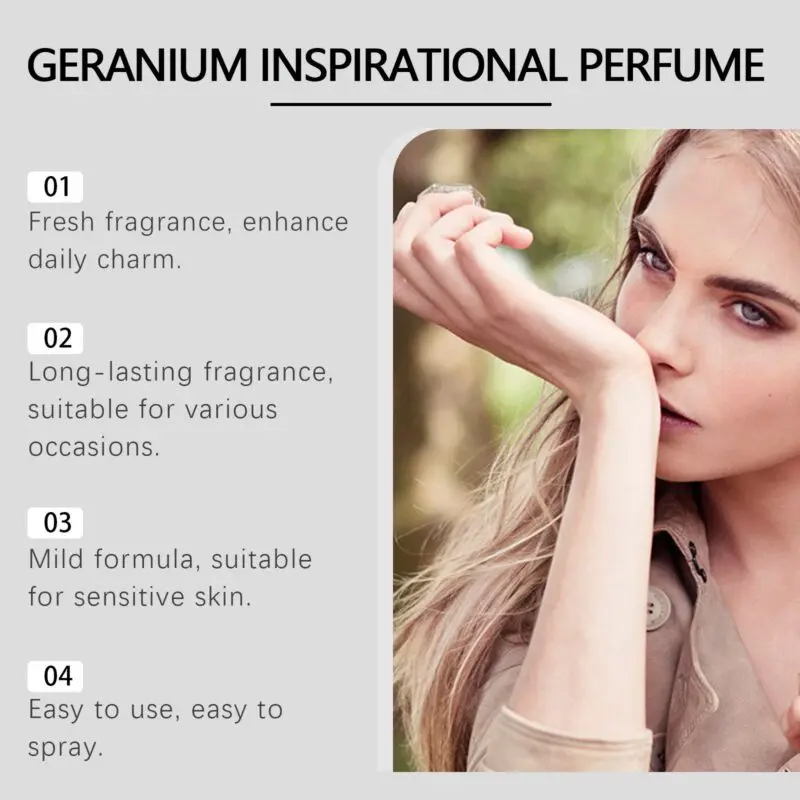 Our geranium-inspired perfume blends sandalwood oil, cedar extract, and vetiver extract for a balanced floral-wood aroma. Features a light, long-lasting scent suitable for daily wear. Apply by gently spraying 1-2 times on pulse points like wrists and neck. Formulated for subtle elegance with non-irritating ingredients. A distinctive fragrance choice for special occasions.