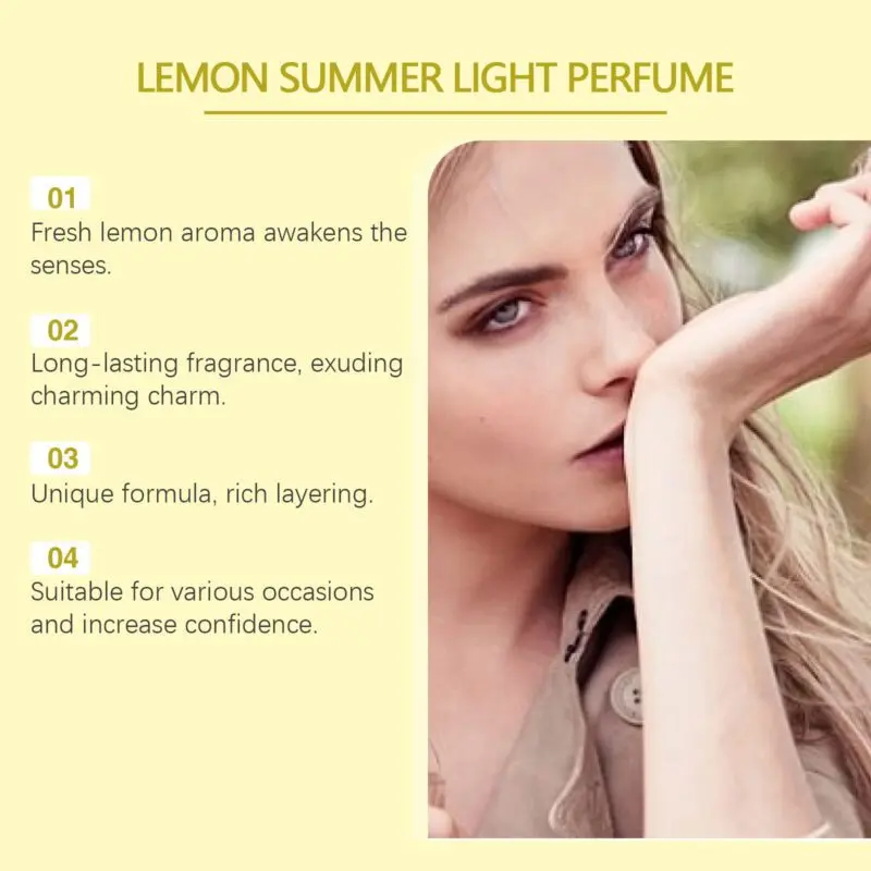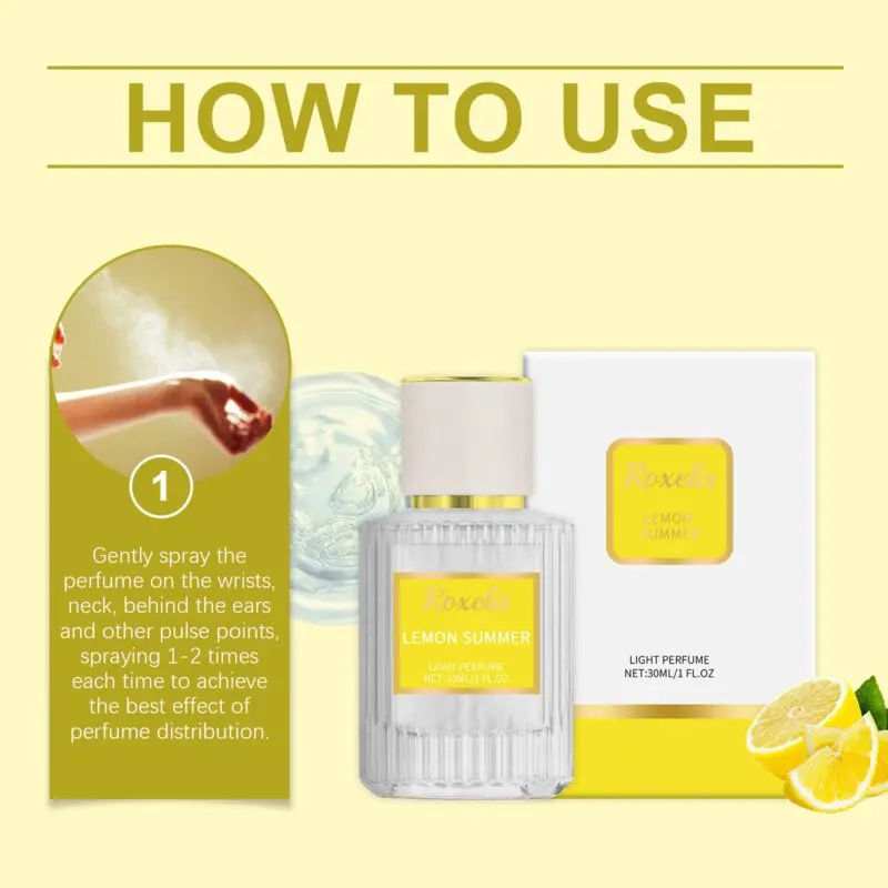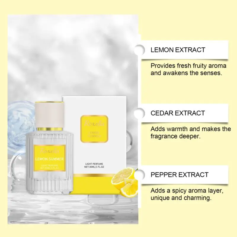 Lemon Summer Perfume features lemon, cedar, and pepper extracts for a fresh citrus aroma with subtle spicy warmth. This lightweight fragrance offers a natural scent profile suitable for daily wear. Apply by spraying 1-2 times on pulse points like wrists and neck for optimal fragrance distribution. Features a long-lasting composition that maintains freshness without stickiness.