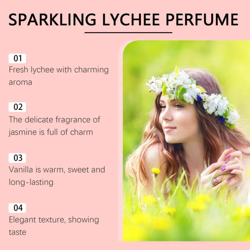 Lychee Crystal Crown Perfume blends rose extract and vanilla fruit extract for a sweet, lasting fragrance. The balanced formula maintains a fresh lychee aroma throughout the day. Apply by spraying evenly on pulse points like wrists, behind ears, and neck. Combines vibrant fruity notes with sophisticated elegance for daily wear.