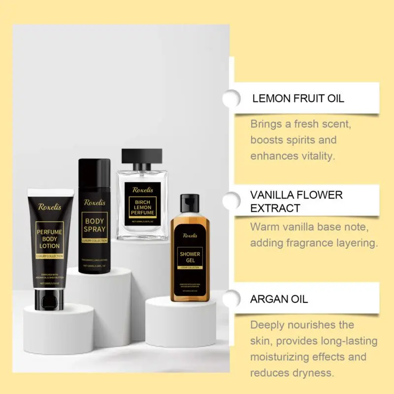 This men’s fragrance set features glycerin, birch bark extract, and lemon fruit oil for a fresh, invigorating aroma. The body wash gently cleanses while maintaining skin moisture, the long-lasting body spray can be applied to pulse points for even distribution, and the moisturizing balm absorbs quickly to reduce dryness. Includes easy-to-follow steps for each product: cleanse with the nourishing body wash, apply the lightweight spray to wrists/neck, and massage the balm into dry areas for hydrated skin. Designed to leave a subtle, enduring fragrance without overpowering.