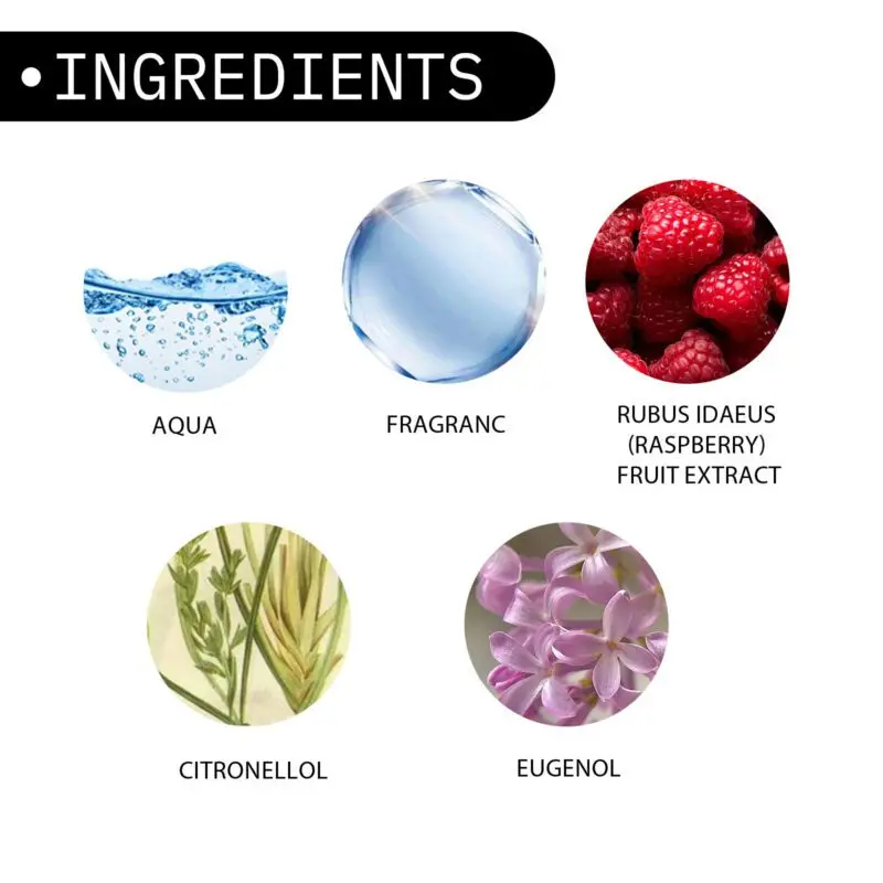 This men’s fragrance combines raspberry fruit extract and citronellol for a fresh, enduring scent. Apply by spraying on pulse points or misting into the air for even distribution. The long-lasting formula maintains freshness throughout daily activities while providing a subtle aromatic presence.