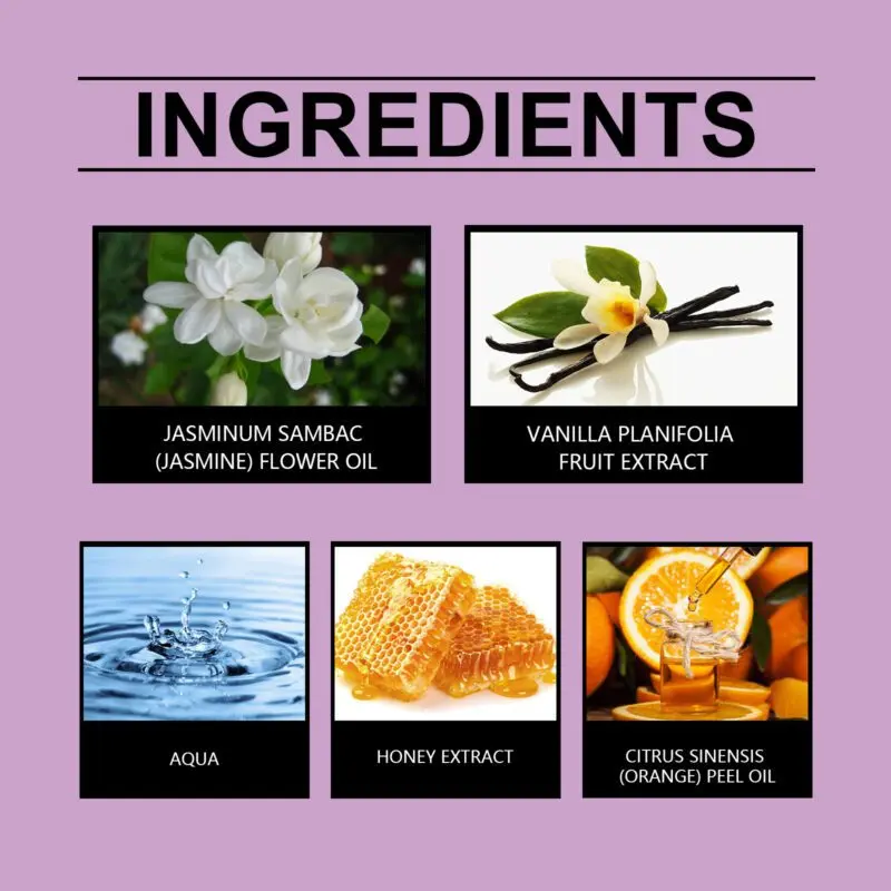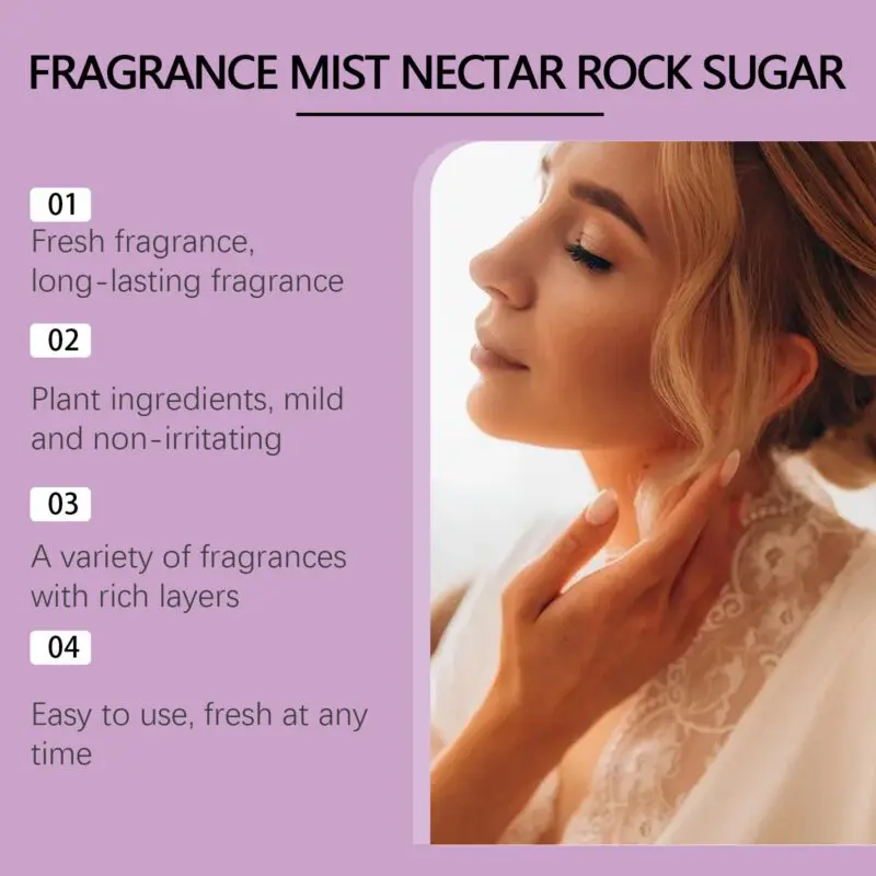 Nectar Rock Sugar fragrance spray blends honey extract with sweet orange oil for a fresh, fruity aroma. Apply by spraying evenly on pulse points like wrists, behind ears, and neck for lasting fragrance. Compact size allows easy portability and quick refresh throughout the day.