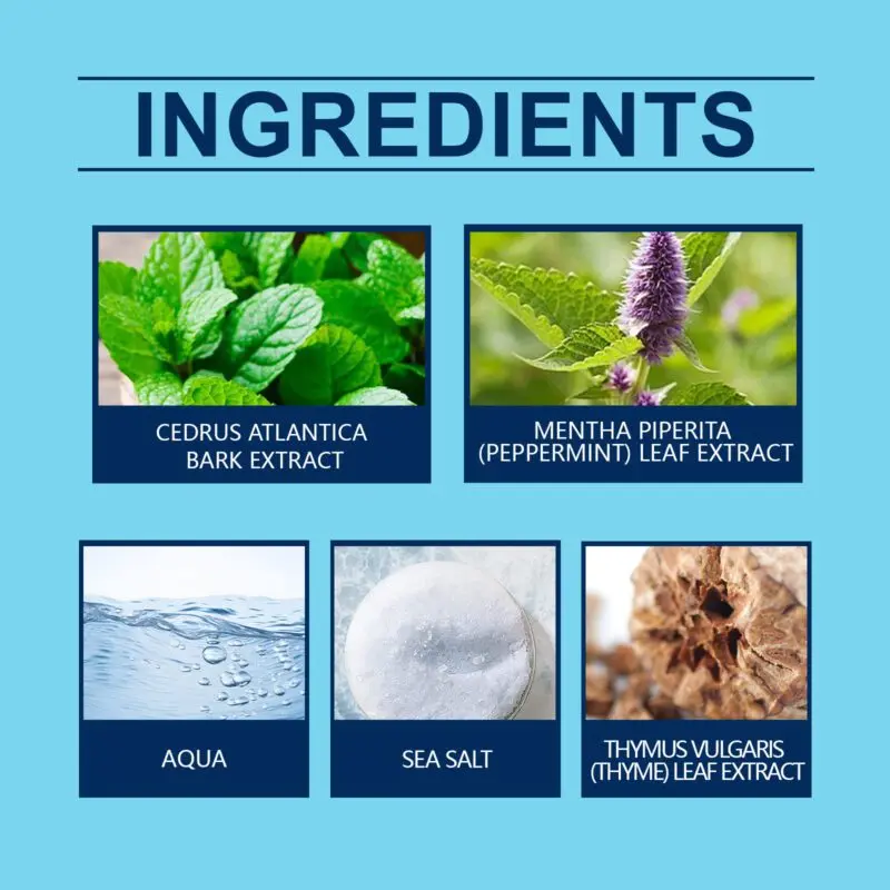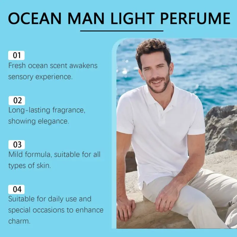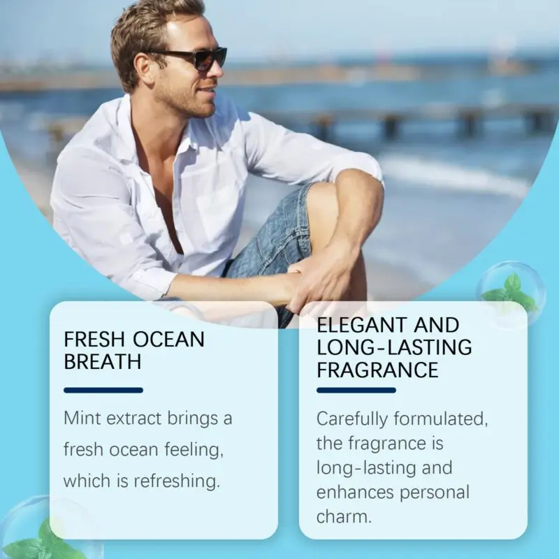 Ocean Fresh Eau De Toilette features peppermint extract, cedarwood, and sea salt for a refreshing aquatic scent. Lightweight formula designed for even distribution when applied to pulse points like wrists and neck. Suitable for all skin types with a balanced blend of mint freshness and marine notes. Simple application: 1-2 sprays per use for optimal fragrance experience.
