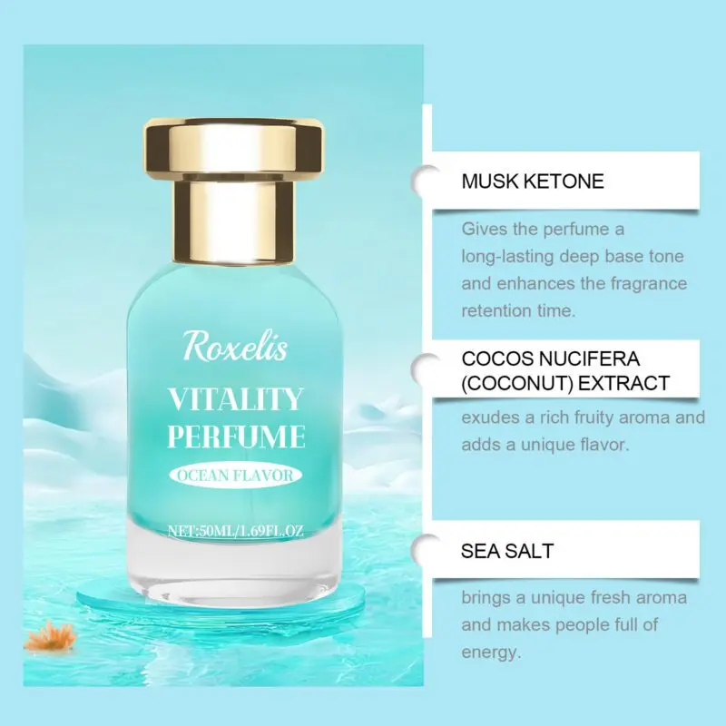 Ocean Vitality perfume blends musk, coconut extract, and citrus for a fresh aromatic experience. The formula features sea salt accord to enhance fragrance longevity while maintaining a light, airy character. Apply by spraying on wrists, behind ears, or neck areas. Can also be misted in air for even distribution. Features a balanced combination of aquatic and tropical notes for daytime freshness.