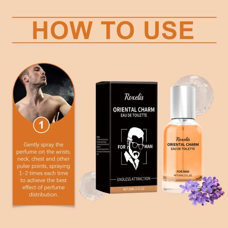 Oriental Charm Eau De Toilette features lemon extract and sandalwood oil for a fresh, mild aroma. Apply by spraying 1-2 times on pulse points like wrists and neck. Designed to provide a lasting fragrance experience with proper application.