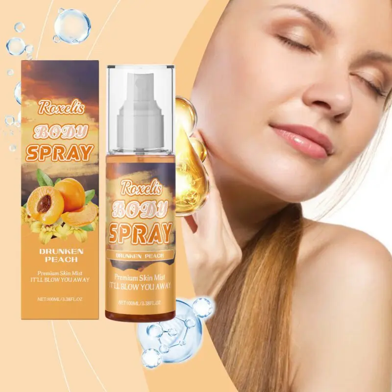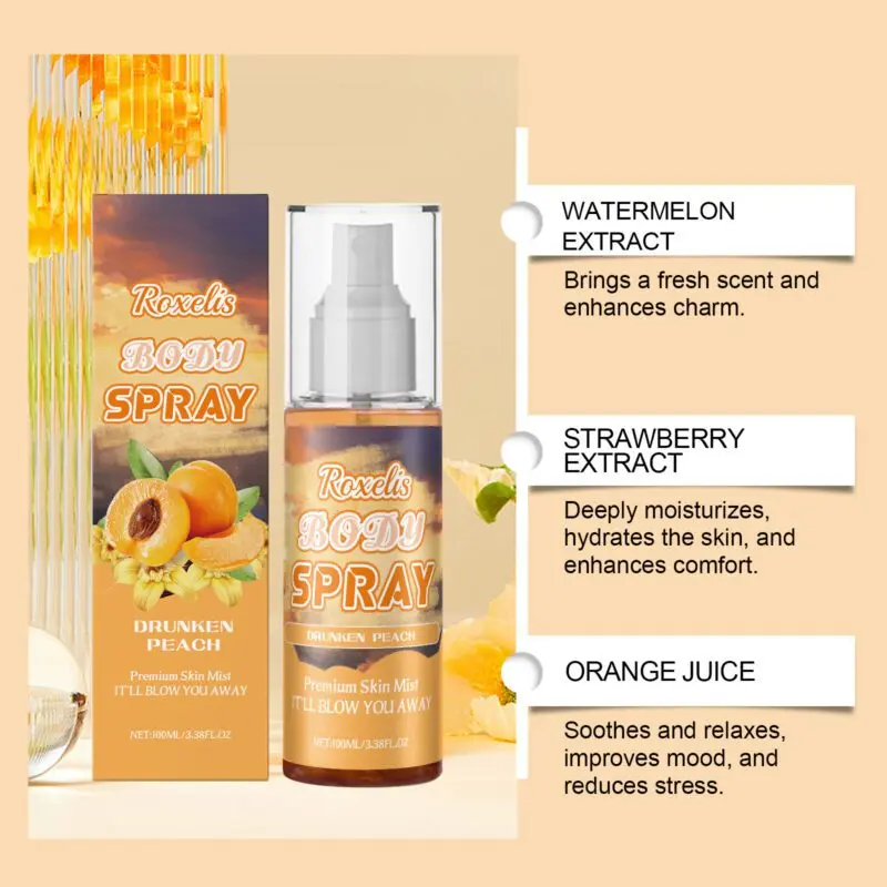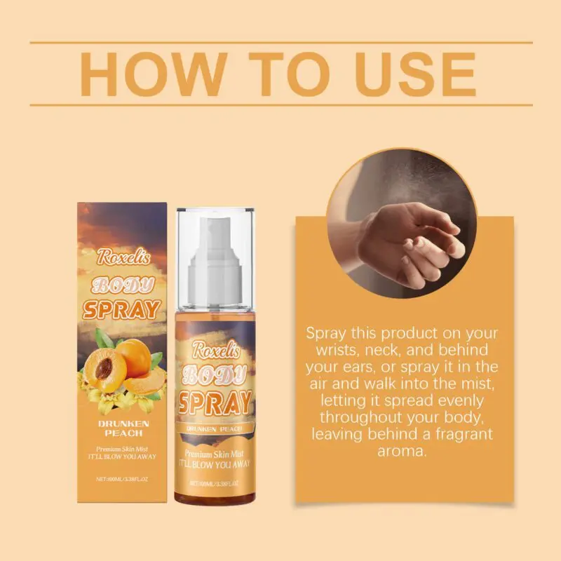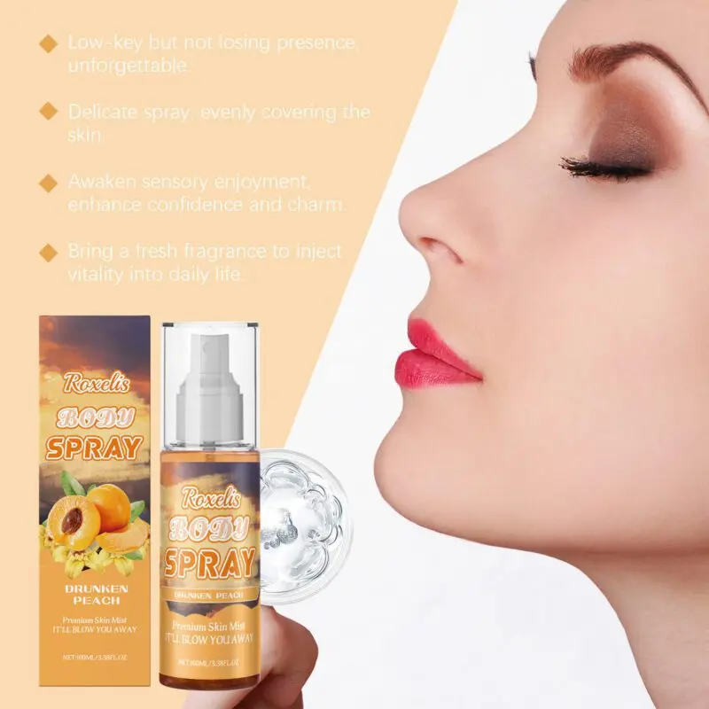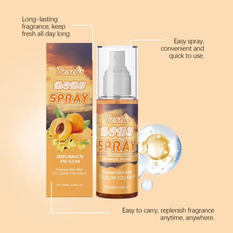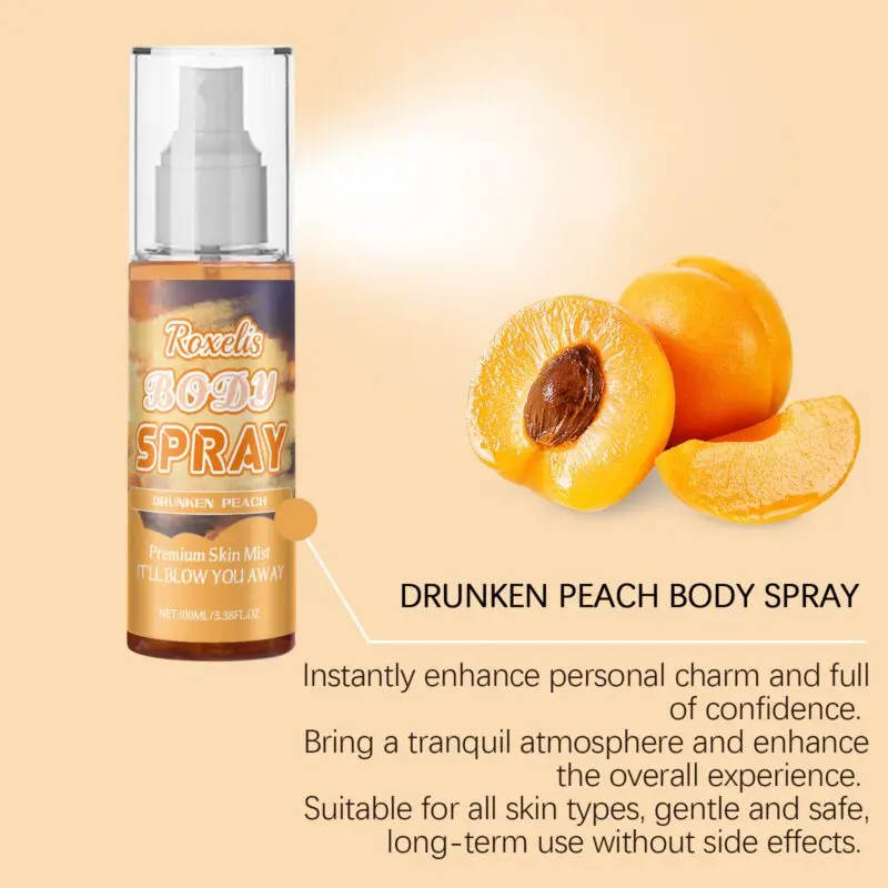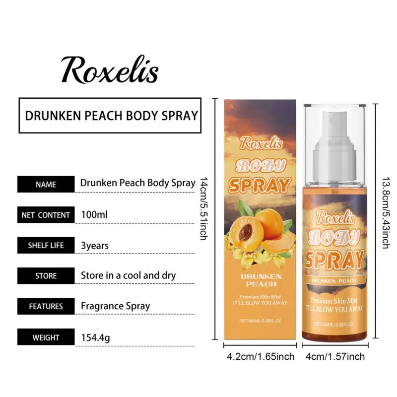Roxelis Peach Champagne Body Spray – Long-Lasting Fresh Fragrance with Soft Tone