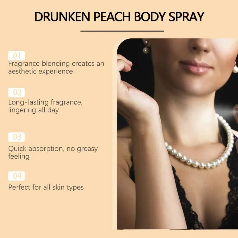 Peach Champagne Deodorant Spray features a light, multi-layered fragrance with fresh peach and champagne notes. Formulated with PEG-40 hydrogenated castor oil and ethylhexyl glycerol, this body mist provides a subtle scent that lingers. For best use, spray on wrists, neck, or behind ears. Alternatively, mist into air and walk through for even distribution. Offers a refreshing fragrance experience while maintaining skin comfort.