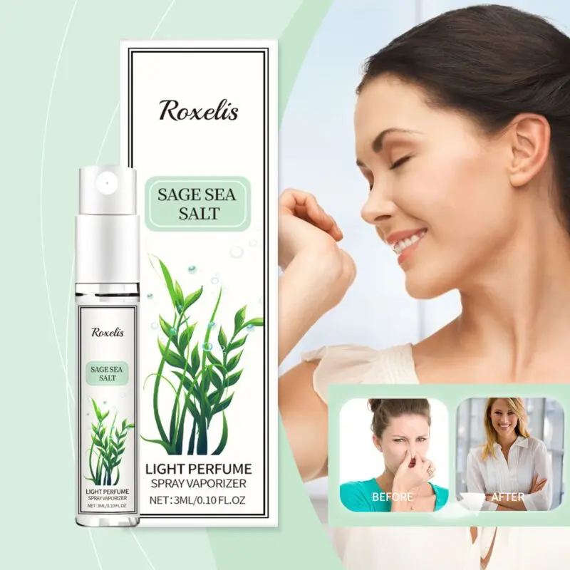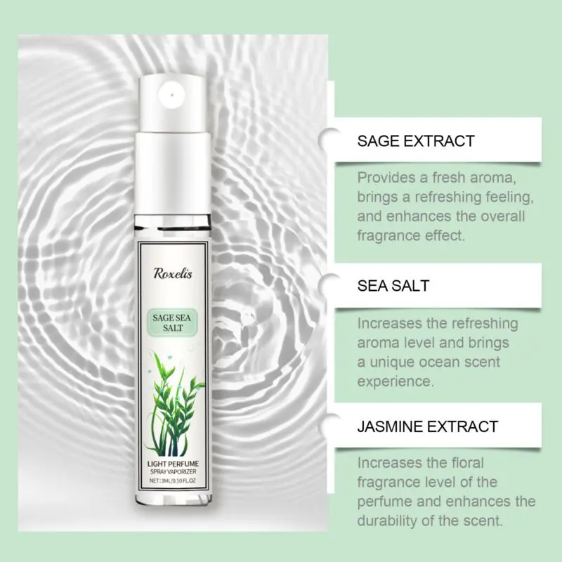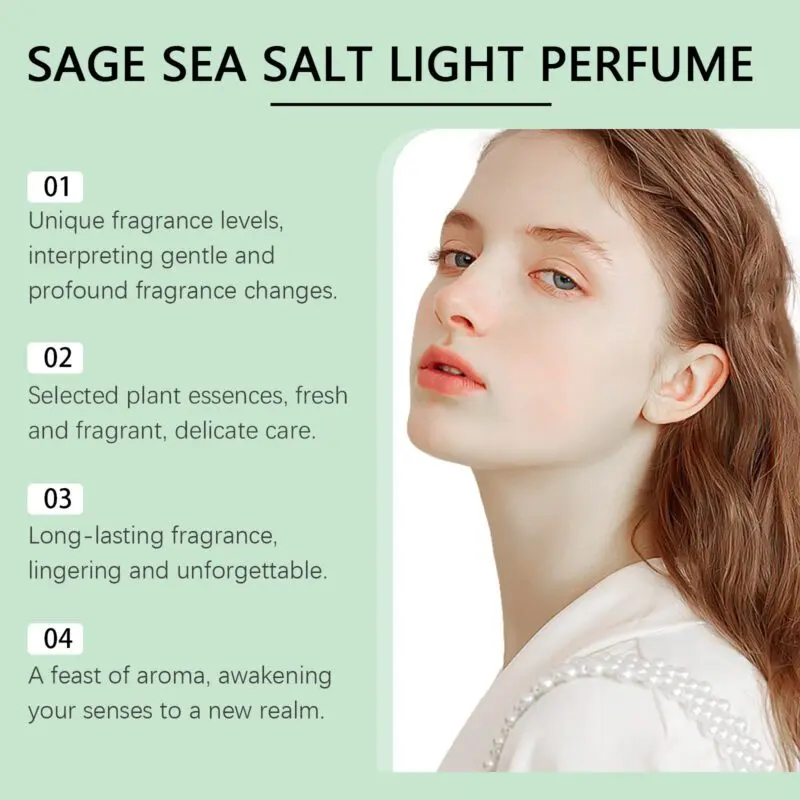 Experience a refreshing marine aroma with our Sage Sea Salt Perfume Spray. Formulated with sage extract, sea salt, and jasmine essence, this fragrance offers a light, airy scent reminiscent of ocean breezes. Apply by spraying on pulse points like wrists and neck, or mist into air for even distribution. Features a gentle, non-irritating formula suitable for daily wear. The crisp fragrance blend creates an invigorating sensory experience while maintaining subtle longevity.
