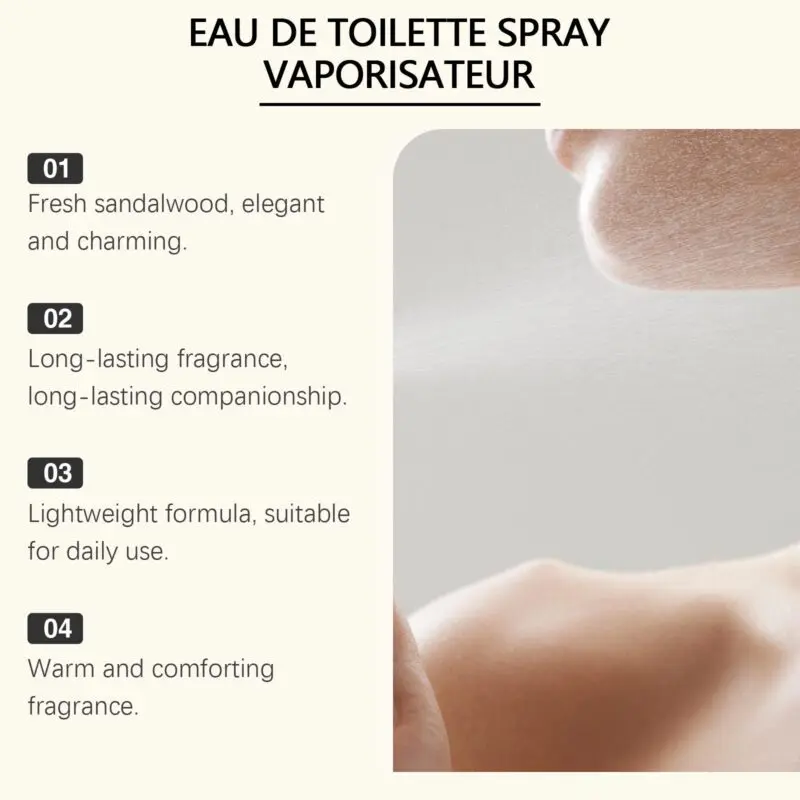 This wood eau de toilette features jasmine extract, neroli oil, and sandalwood oil for a warm, comfortable fragrance. Apply by spraying on wrists, behind ears, or neck. Lightweight formula creates subtle aromatic appeal without overpowering intensity. Ideal for daily wear and special occasions.