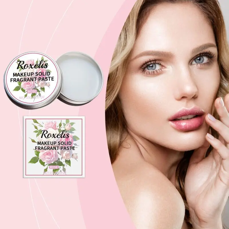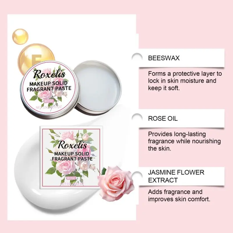 Solid rose balm infused with rose oil, freesia extract, and vitamin E. Provides lasting fragrance while nourishing skin. Shea butter and beeswax moisturize effectively to prevent dryness. Apply to wrists, neck, or behind ears using fingertips for even coverage. Maintains elegant fragrance throughout the day with skin-friendly ingredients.