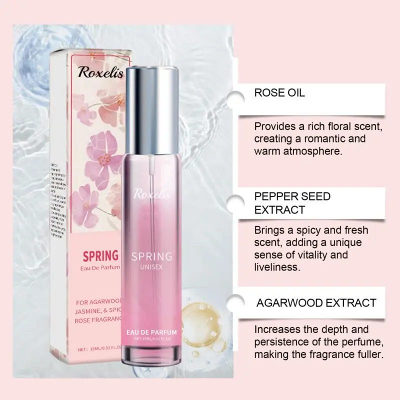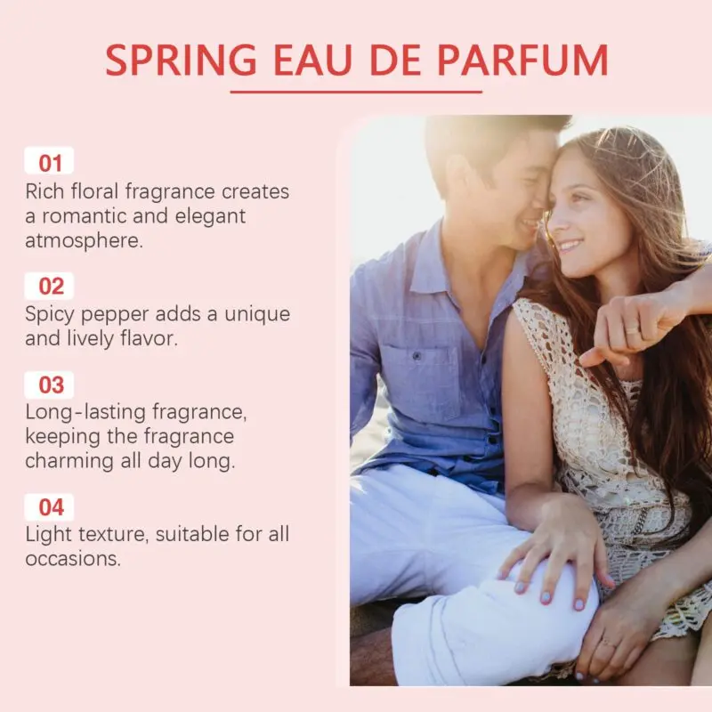 Spring perfume infused with rose oil, pepper seed extract, and agarwood extract enhances fragrance depth and richness. Apply by spraying on wrists, neck, or behind ears. For even distribution, spray into the air and walk through the mist. Features a balanced blend of spicy freshness and floral sweetness, creating a versatile long-lasting scent for daily wear.
