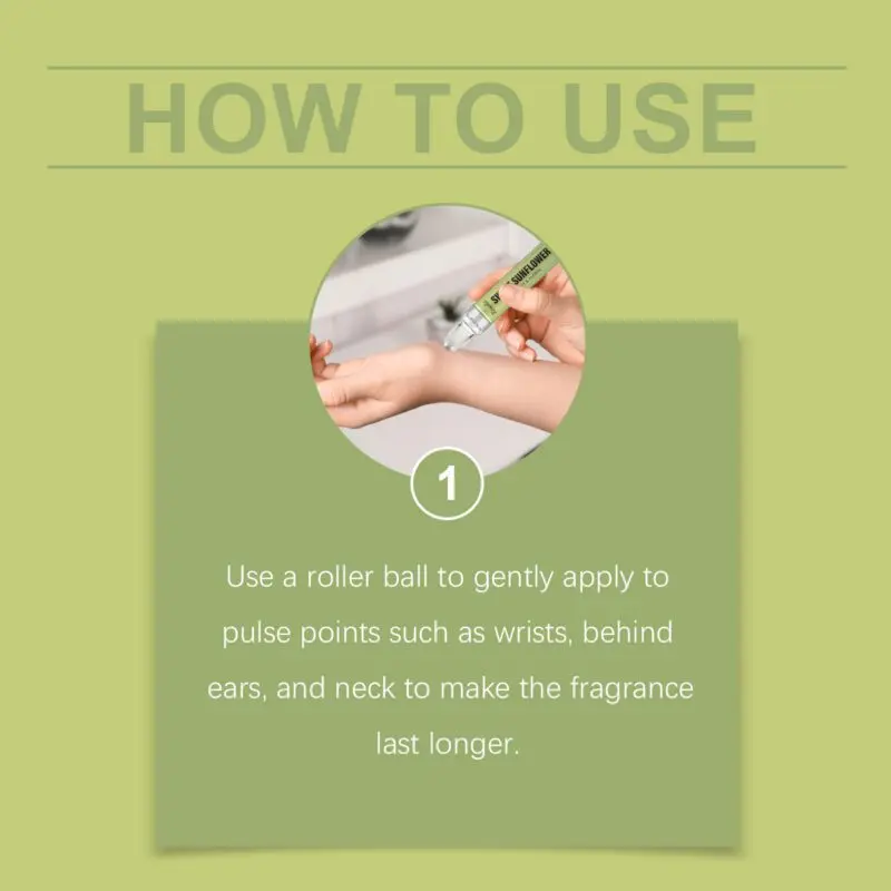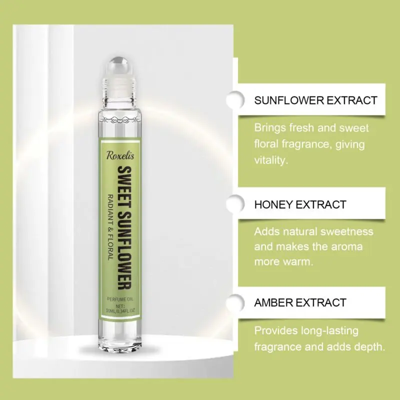 Sweet Sunflower perfume roller features sunflower extract, honey extract, and amber extract for a fresh floral aroma. The formula includes natural ingredients that create a warm, sweet fragrance. Apply gently to pulse points like wrists and neck using the convenient rollerball design. Contains musk for enhanced scent layering and longevity. Lightweight formula suitable for daily wear with a subtle, uplifting fragrance profile.
