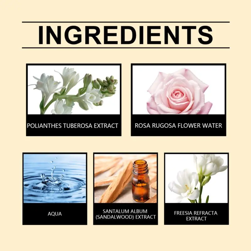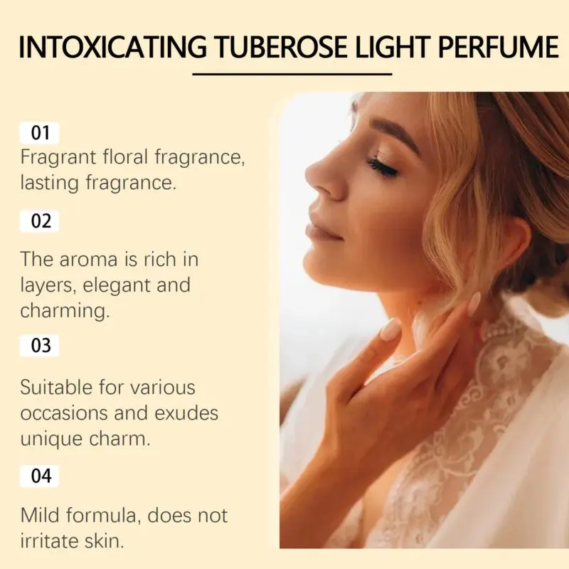 Tuberose Charm Eau de Toilette combines tuberose extract, rose water, and sandalwood for a sophisticated floral fragrance. Features fresh sweet floral notes layered with warm woody undertones for lasting aroma. Apply by gently spraying on pulse points like wrists and neck. Suitable for both daily wear and special occasions, offering an elegant scent profile with floral and citrus accents.