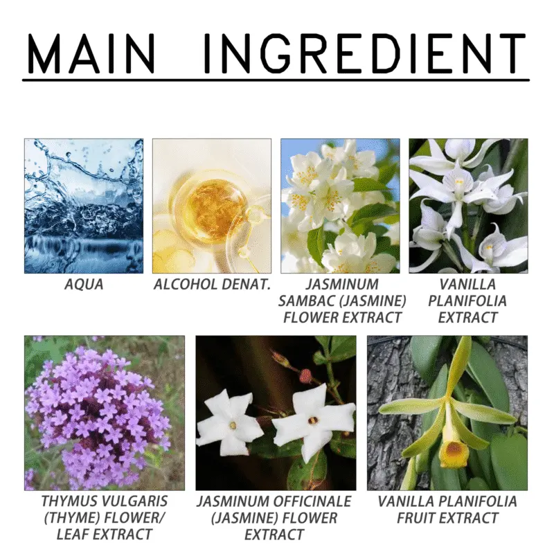 Vanilla Jasmine fragrance spray with vanilla orchid fruit extract and jasmine flower extract. Versatile fragrance solution for hair, body, bedding, and clothing. Apply by misting on pulse points or spraying into air for even distribution. Creates a fresh, lasting aromatic environment without overpowering scent.