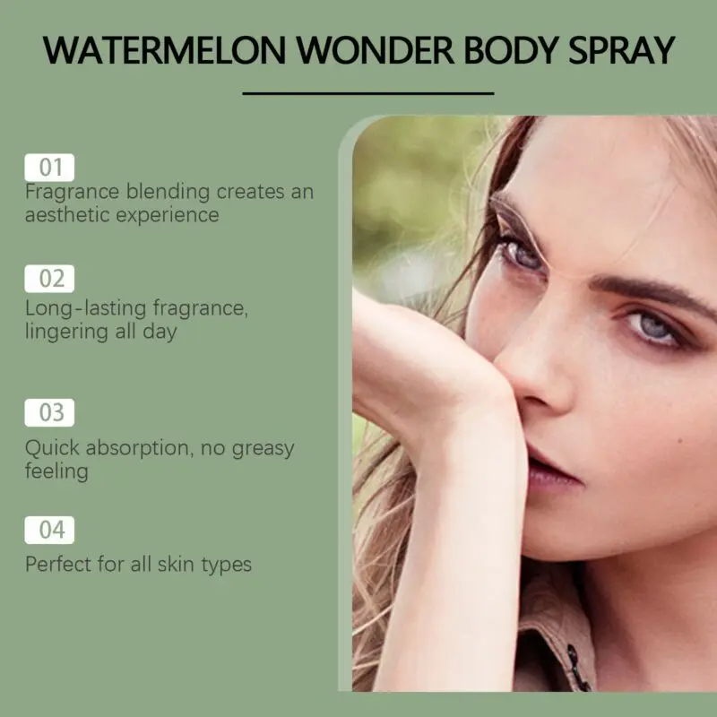 Lightweight women’s fragrance spray featuring a refreshing watermelon and fruit scent blend. Apply to pulse points or mist into the air for even distribution. Provides a subtle, elegant aroma while helping to uplift mood. Formulated with skin-friendly ingredients for comfortable wear.