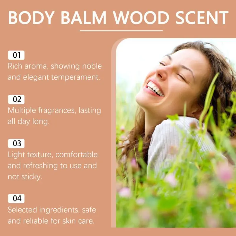 This black wood body balm features vanilla extract, sandalwood oil, and agarwood extract for a refined woody aroma. The formula helps maintain fragrance depth while providing a balanced blend of fresh and spicy notes. Apply by opening the balm container, taking a small amount, and massaging onto pulse points like wrists, neck, or behind ears. The lightweight texture ensures even coverage without stickiness for subtle, elegant scent enhancement.